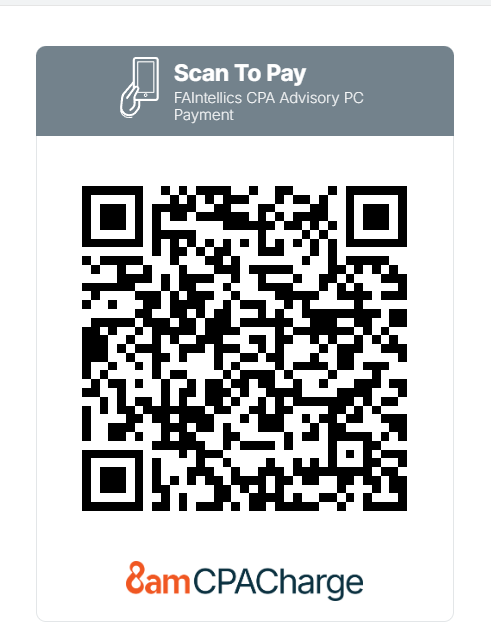 At FAIntellics, we offer flexible payment options designed to make the payment process secure, simple, and convenient. Clients may submit payment online through our PCI DSS-compliant one-click payment links, without a login required; scan a QR code for fast mobile payment; or make payment in person at our office. We accept major credit cards, ACH/EFT bank transfers, and mobile payment options. Below are two convenient ways to pay online: use our secure payment page to submit your payment online, or, if you prefer mobile payment, scan the QR code to pay quickly and securely.